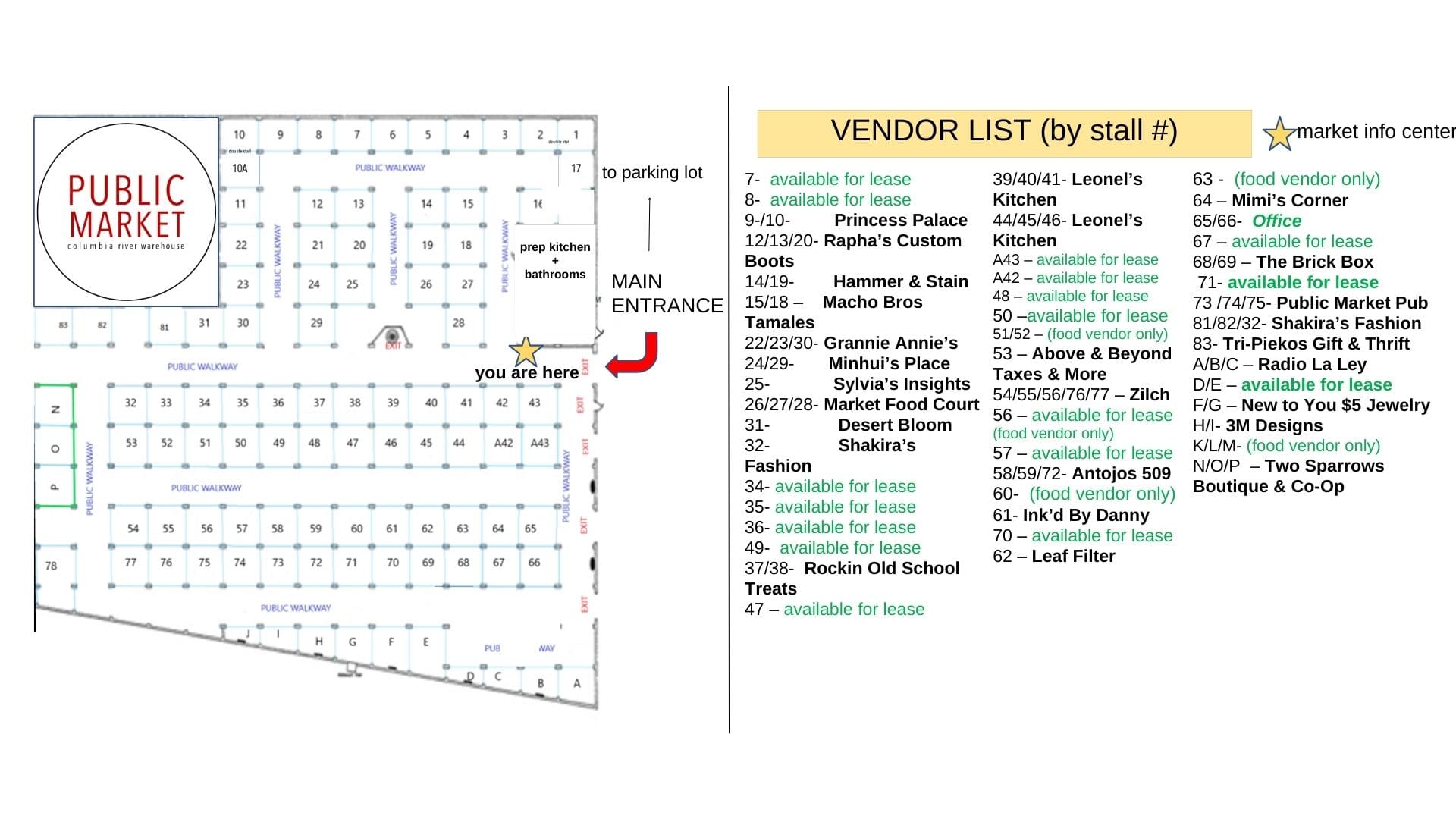 Find your way around our indoor marketplace! Our vendor map will help you easily navigate through the market, and find the artisanal food producers and unique craft vendors you’re looking for.